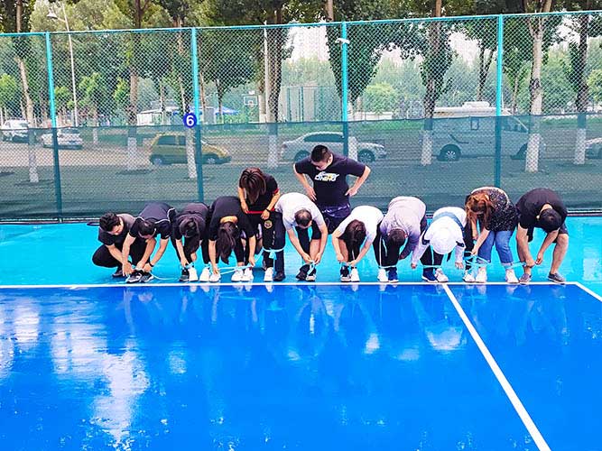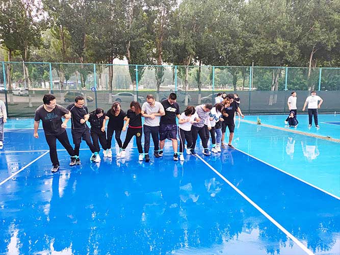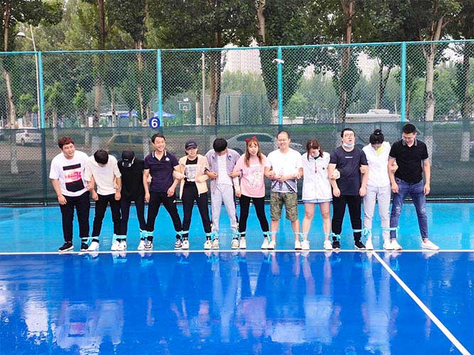 大家一排站好,從左到右,每人的右腿與另一人的左腿依次并齊,并用扁帶繩子系上,繩子綁的位置是腳踝以上部分。聽見哨聲即為游戲開始,從起點(diǎn)到終點(diǎn),按用時(shí)由短到長,取前五名依次加分。